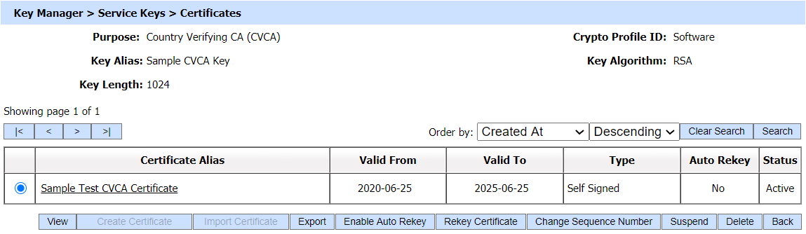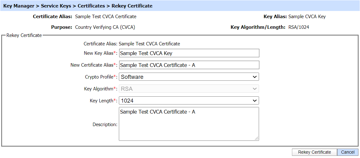 To rekey a CVCA or DVCA certificate, navigate to the following screen: