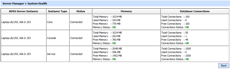 Following is the screen of System Health which will show that which of the ADSS Server instances are installed and their statuses. Memory will show the Total Memory which is allocated and how much memory is being used by the instance. Database Connections will show that how much connections are assigned (Total Connections) and how much connections are being used and how much connections are remaining (Free Connections). There are three statuses of "Memory" and "Database Connections" which are OK, Alarming and Critical. As used memory or database connections limit will reach up to 80% of total system will change the status to "Alarming" and as total limit will reach up to 90% system will show the status as "Critical".