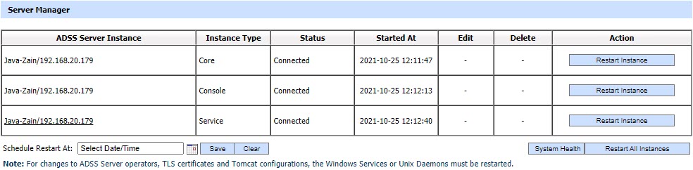 The Server Manager module provides centralized service stop and start as well as a full configuration reload functionality for all ADSS Server services, system processes, system cache and configurations. All ADSS Server instances using the same database are shown and thus it is possible to control all services on any ADSS Server instance from this control panel.