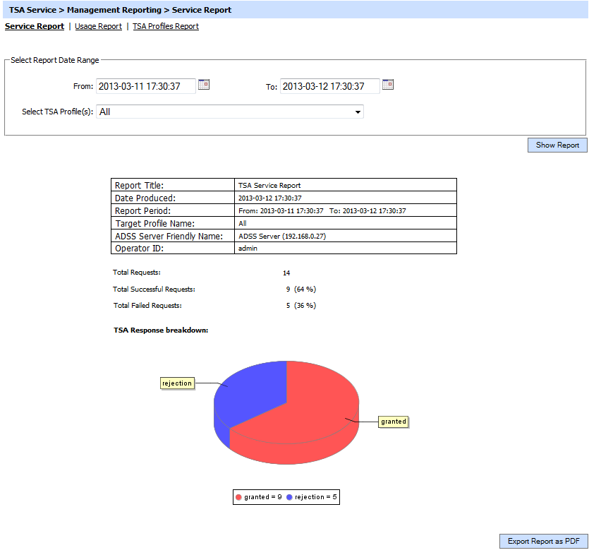Select a particular TSA profile for which you want to see the statistics otherwise choose ALL option. By pressing the Show Report button the screen will be refreshed to show you the results concerning the number of success and failed transactions during that date range. |