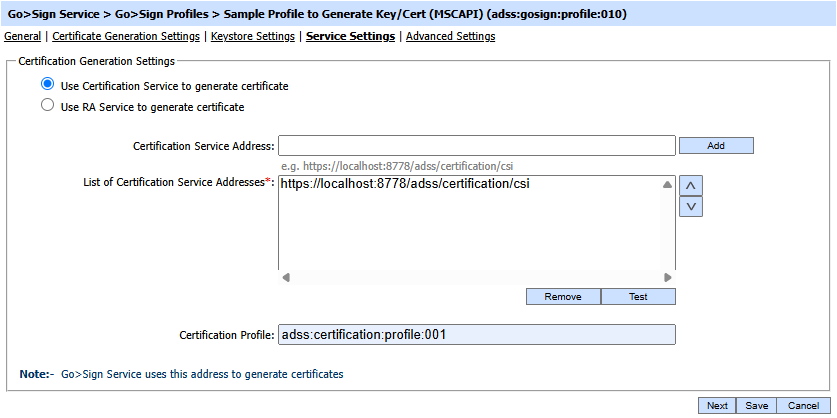 This field will show the configured certification service addresses that will be used to generate the certificates in fallback mode. By clicking the Test button, you can test the liveliness of a server. You can remove any configured address by clicking the Remove button. |