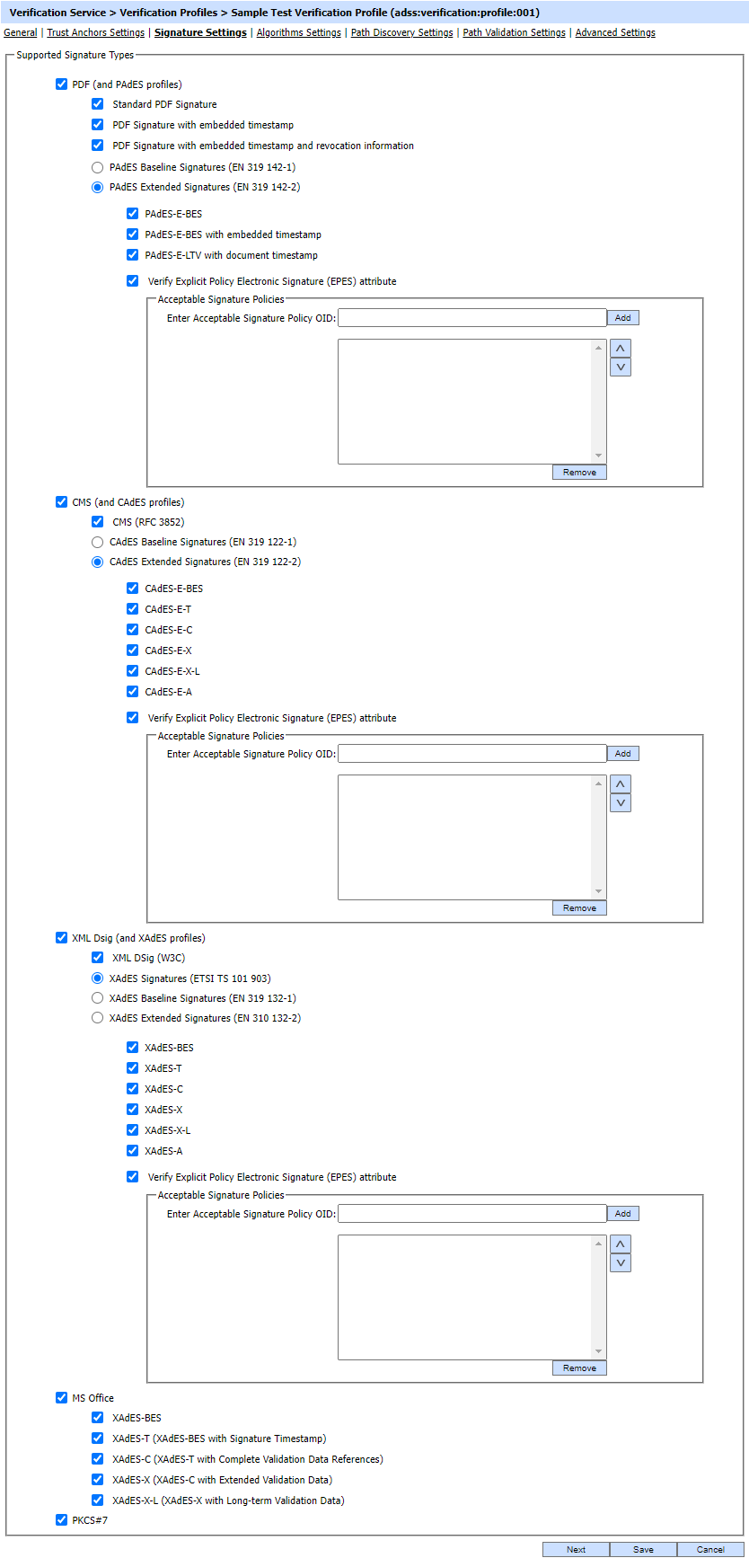 This page is used to configure the type of signatures that this profile will be used to verify: