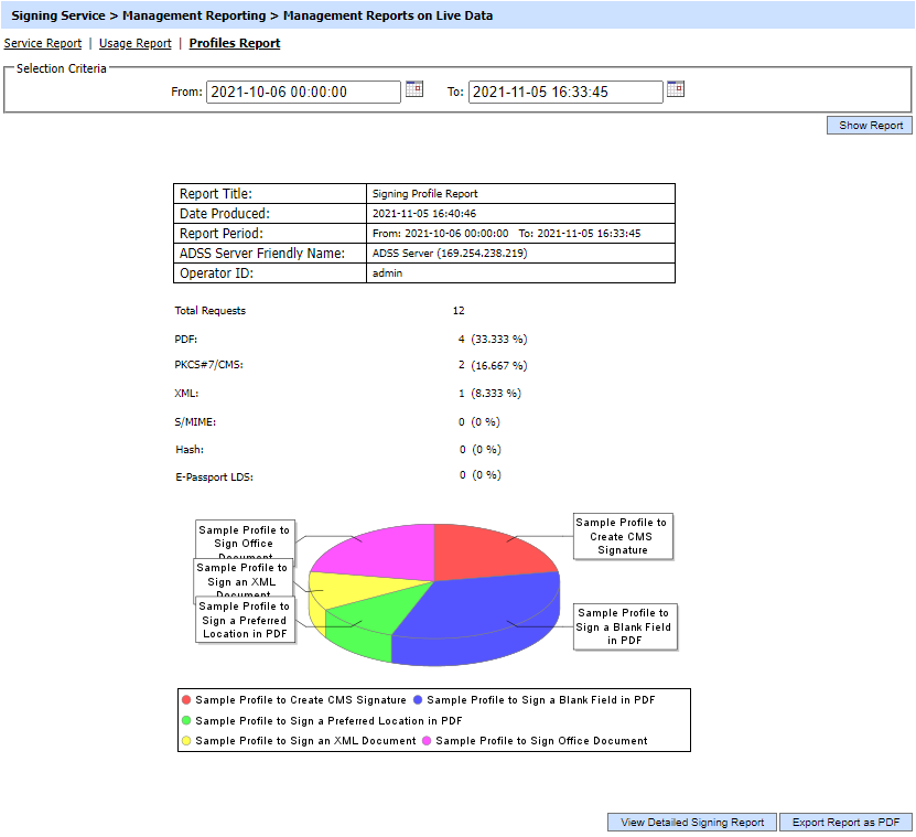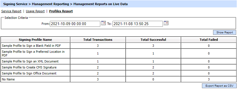 The report shows the number of transactions for each signing profile. Simply select the desired date range and then press the Show Report button. This report can be exported as a PDF. A detailed signing profile report can also be generated which shows the actual figures per signing profile in a tabular format and this can be exported to a zipped CSV file.
