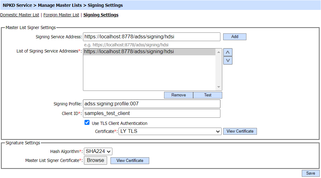 NPKD Service communicates with Signing Service in order to sign the domestic Master List. The Signing Settings tab will allow the operator to define the required configurations in order to enable the signing service to sign the Domestic Master List.