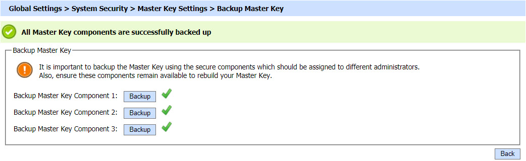 At this stage, the Master Key has been generated, now the backup of the generated master key needs to be taken. Three operators will be required to take backup of each component. Clicking on the backup button will lead you to the following screen: