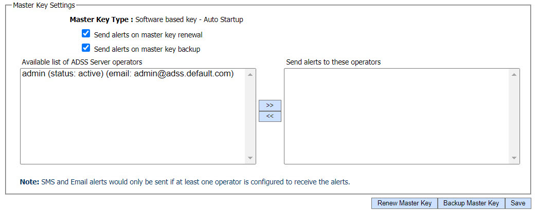 In the above screen, the Master Key Type can be seen and if the operator wants to receive alerts upon renewal or backup of master key, it is recommended to enable the alerts by marking the respective checkbox. Clicking on Renew Master Key button will lead you to the screen below: