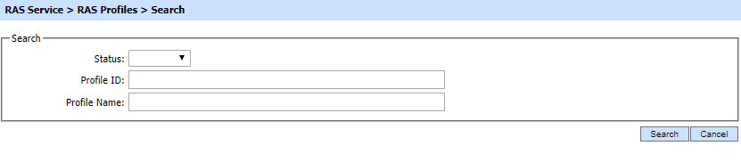 This helps to locate a particular RAS profile, the RAS Service may have configured. The RAS profile can be searched based on "Status", "Profile ID", "Profile Name". If a search is based on multiple values, then these will be combined together using the “AND” operand, and thus only records that meet all the criteria will be presented.