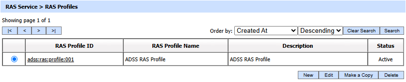 The table of RAS profiles can be sorted in either Ascending or Descending order by selecting a table column from the drop down list. The list can be sorted by RAS Profile ID, RAS Profile Name, Created At time or Status.