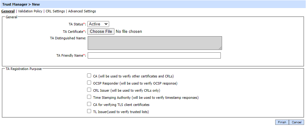 A unique name for the Trust Authority (TA). The name of the Trust Authority is automatically set to the Common Name (CN) of the imported TA certificate. You can also change the TA Friendly Name to something other than the CN of the TA Certificate.
