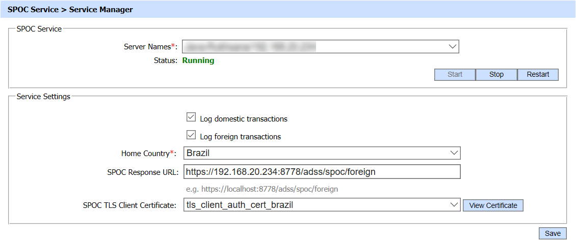 To configure SPOC Service with ADSS Server, the service manager module must be configured first. The SPOC service manager module allows operators to start, stop or restart the SPOC service and also make configurations related changes to the service.