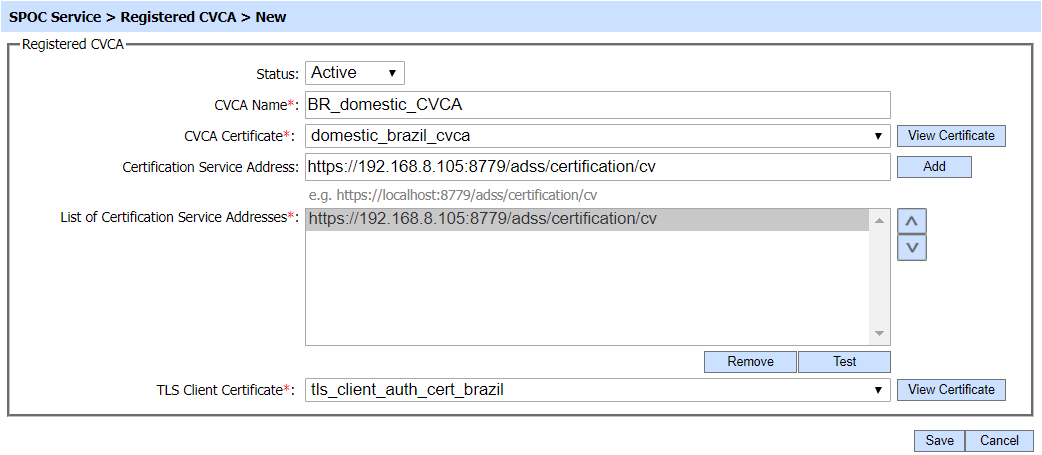 To configure ADSS SPOC Service, a domestic CVCA which is the root CA for a country, needs to be registered inside Registered CVCA sub-module. Since SPOC forwards requests to national CVCA, so the CVCA must be registered inside SPOC with proper communication settings.