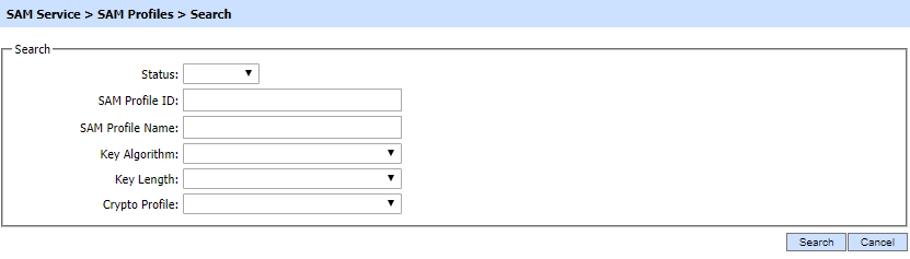 This helps to locate a particular SAM profile the ADSS SAM Service may have configured. The SAM signing profile can be searched based on Status, SAM Profile ID, SAM Profile Name, Key Algorithm, Key Length and Crypto Profile. If a search is based on multiple values, then these will be combined together using the “AND” operand, and thus only records that meet all the criteria will be presented.