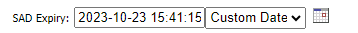 It defines the time period after which the SAD will be expired automatically. If SAD Expiry is not provided here, then, the system will use the SAD expiry provided in the SAM_REQUEST_EXPIRY_PERIOD property in Global Settings > Advanced Settings. The operator can define the SAD expiry according to the selected unit form the drop-down, or, by defining a customized date of expiry using the Custom Date option. See the image below: