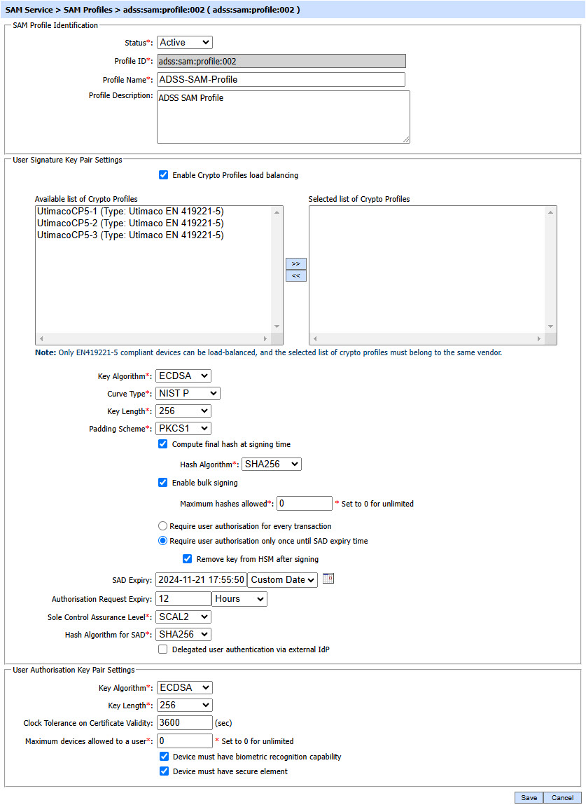 To make it easier for business applications to request management of users, keys and devices along with signing operations, the ADSS SAM Service uses SAM Profiles. A SAM profile defines the format and characteristics of the keys (e.g. which public key algorithm and key length to be used) and define characteristics of user devices (e.g. which public key algorithm and key length to be used, device has bio-metric support) that will be used when this profile is referenced in a user keys generation, device registration and signing request from a client application.
