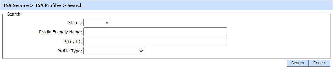 The search option helps an operator to identify a particular TSA profile that may have been configured. The TSA profile can be searched based on Status, Profile Friendly Name, Policy ID and Profile Type. If a search is based on multiple values, then these will be combined together using the “AND” operand, and thus only records that meet all the criteria will be presented.