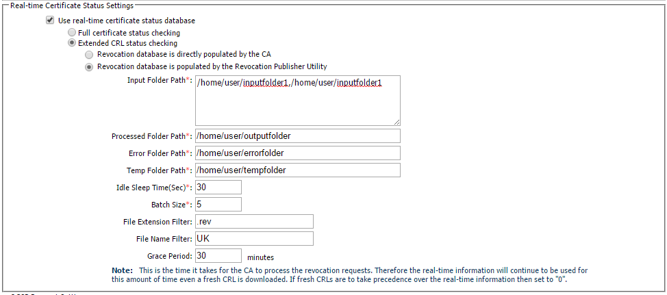 However for option Extended CRL status Checking under the CRL revocation checking mechanism is to also check a real-time certificate status database, i.e. first check the current CRL for that CA and then determine if there is more recent certificate status information for the relevant certificate in the real-time database table for that CA. This requires the use of the Ascertia Revocation Publication Utility (RPU) to be installed and also configured within the Global Settings as described here.