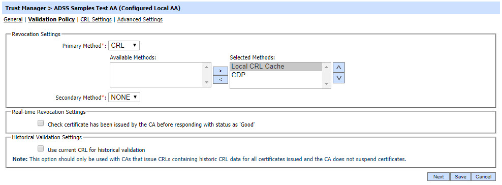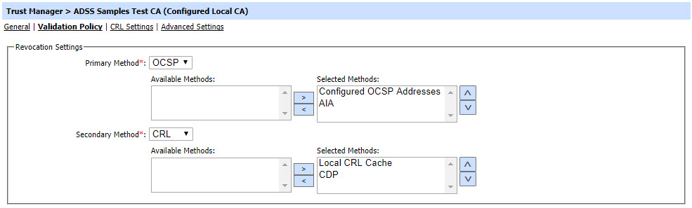 The setting can be either OCSP or CRL. The most common settings used are OCSP as a primary mechanism and optionally CRL as secondary method. This is useful in cases when primary mechanism fails e.g external OCSP communications fail then this secondary mechanism provides an automatic backup method allowing ADSS Server to use the secondary mechanism i.e CRLs retrieved within the CRL Monitor. OCSP can be defined as a secondary method to CRLs if required, although this is considered unusual. |