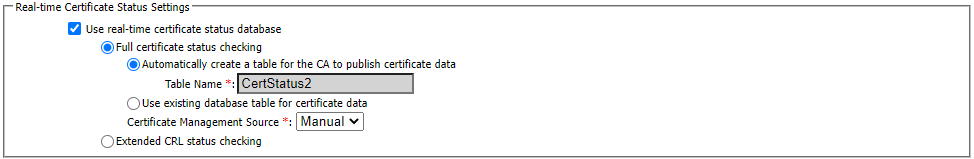 If the Real Time Revocation Database is configured under Global Settings then the real time certificate status settings will be available for configurations for External CAs. Following two options will be available for real time certificate status checking: