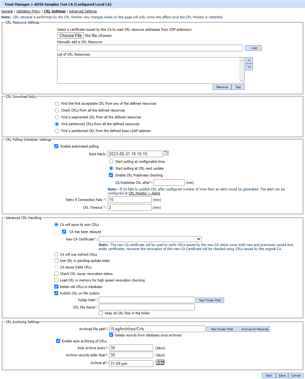 This defines the date and time when the next attempt will be made to retrieve the CRL for this CA. Normally ADSS Server automatically sets this field, however for the first poll time the ADSS operator may define this. Note: For each CA, the CRL Next Fetch time is set as: time when CRL polling last completed (whether failed/successful) + Polling Period. Here the Polling Period can be Polling Period or Failure Polling Period depending on whether the attempt was successful or not. Any change in CRL Next Fetch done manually in Trust Manager by the ADSS operator (or any other change in the CRL Polling Settings section) will only be effective once the CRL Monitor is restarted. |