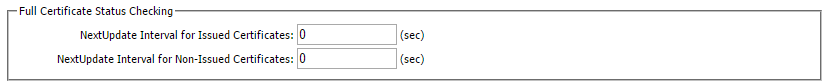 Number of seconds added to the current date and time to be set as next update in OCSP response for issued target certificates when Full certificate status checking is enabled for the issuer CA in Trust Manager. Default Value is "0" (next update not get added). |