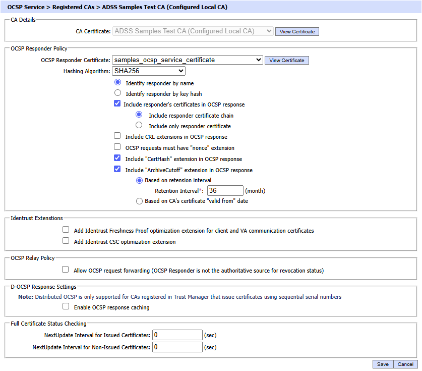 If selected, then OCSP service will add this extension in the single OCSP response. This extension contains the archive cutoff date, a date used by the OCSP responder for historical revocation of a certificate. An OCSP ArchiveCutoff date contribute to a proof that a digital signature was (or was not) reliable on the date it was produced even if the certificate needed to validate the signature has long since expired. |