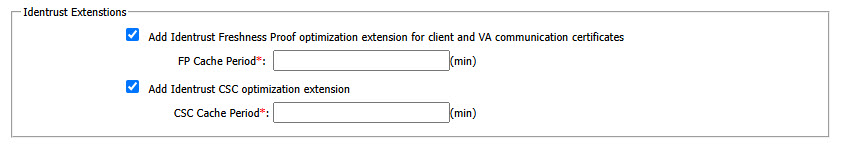 If selected, the FP (Freshness Proof) extension is included in the OCSP Response. If enabled, the OCSP service will poll for FP Responses. FP Cache Period is the time period after which OCSP service will poll for FP responses from the IdenTrust Root. This extension should normally be only used within the Identrust PKI environment for optimisation purposes. |