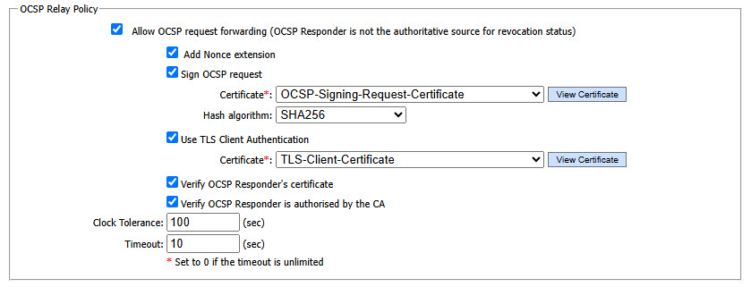 Select this checkbox if the OCSP Responder requires OCSP request messages to be signed. Then select the OCSP Request signing Certificate which pre-exists in the Key Manager. |