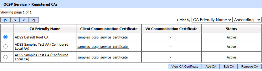 This shows a table of the existing registered CAs. These registered CAs can be sorted in either Ascending or Descending order by selecting a table column from the drop down list. The list can be sorted by status or CA Friendly Name.