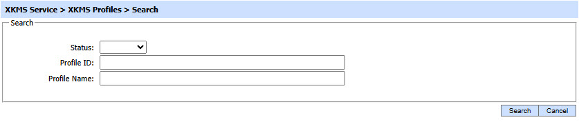 This helps to locate a particular type of XKMS profile generated in the XKMS Service. The profiles can be searched based on Status, Profile ID and/or Profile Name. If a search is based on multiple values, then these will be combined together using the “AND” operand, and thus only records that meet all the criteria will be presented.