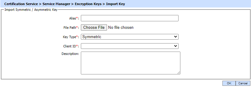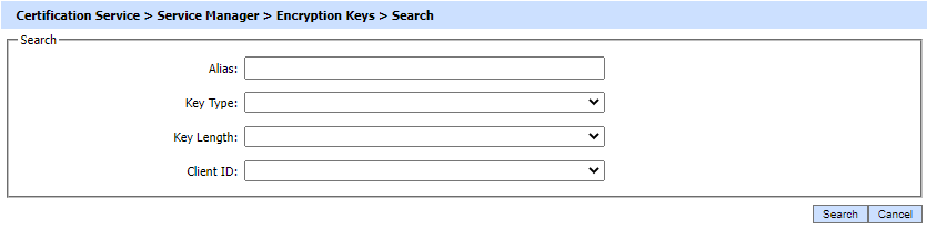 This helps to locate an encryption key that the Certification Service may have issued. Encryption Keys can be searched based on Alias, Key Type, Key Length and Client ID. If a search is based on multiple values, then these will be combined together using the “AND” operand, and thus only records that meet all the criteria will be presented.