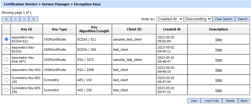 Clicking on the 'View Encryption Keys' button will show the list of all the encryption keys to be used for encryption purposes. These keys will be used to create digital enveloped data. Note: In EST, symmetric or asymmetric key required for encryption of server-side generated private key. |