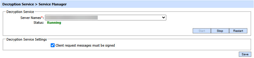 The Decryption Service Manager module allows operators to start or stop the Decryption Service and also make the miscellaneous service related configurations. The Service Manager is accessed as follows: