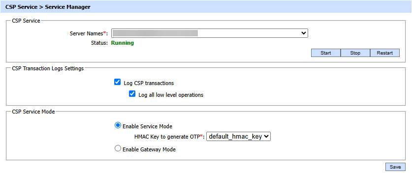 After making configuration changes within the ADSS CSP Service the service must be restarted for the changes to take effect. The service manager module allows operators to start, stop or restart the CSP Service and also make changes to service related configurations. Click on the "Service Manager" button and this screen is shown: