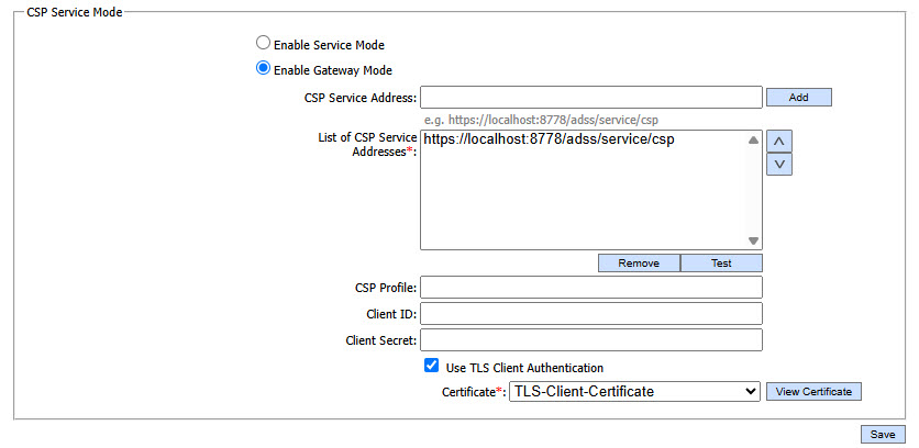 This field shows the CSP Service addresses that can be used to forward requests to the back-end CSP Server. Multiple service addresses can be added. The Test button checks that the service is available. The Remove button deletes a configured service address.