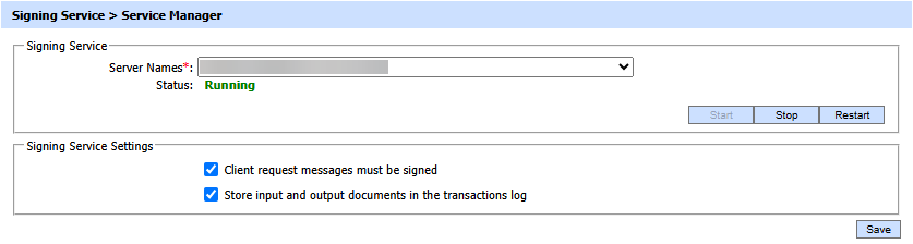 The address of the Signing Service being controlled from this Service Manager. Ensure the address points to the correct service URL, i.e. if you are running the service on multiple machines in a load-balanced configuration then check that the name is correct for the particular instance that needs to be started/stopped/restarted. By default it will be that of the local machine.