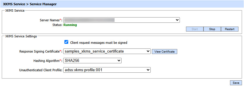 To start or stop the XKMS Service, go to the Service Manager tab and ensure the correct address is shown: