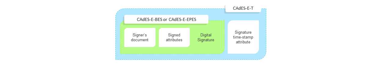 - CAdES-B-T (Signature with Time): A Timestamp is added from trusted TSA to CAdES-B-B signature. This helps to independently prove the time of signing. The configuration of TSA address(es) is described in this section: Configuring Time Stamp Authorities (TSA).