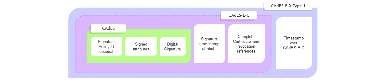- CAdES-E-X (Extended Validation Data) Type1: This adds a time-stamp token on the CAdES-E-C itself to provide trust over all the elements and references. This protects the certificates, CRLs, and OCSP responses in case of a later compromise of a CA key, CRL key, or OCSP issuer key:
