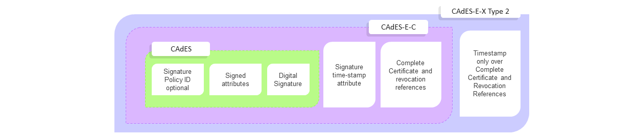 - CAdES-E-X (Extended Validation Data) Type2: This adds to the CAdES-E-C format the CAdES-E-C-time-stamped-certs-crls-references attribute, whose content is a time-stamp token on the certification path and revocation information references. This provides integrity and trusted time protection over all the references. This may protect the certificates, CRLs and OCSP responses in case of a later compromise of a CA key, CRL key or OCSP issuer key. Note Type 1 and Type 2 are essentially very similar and protect against the same threat: