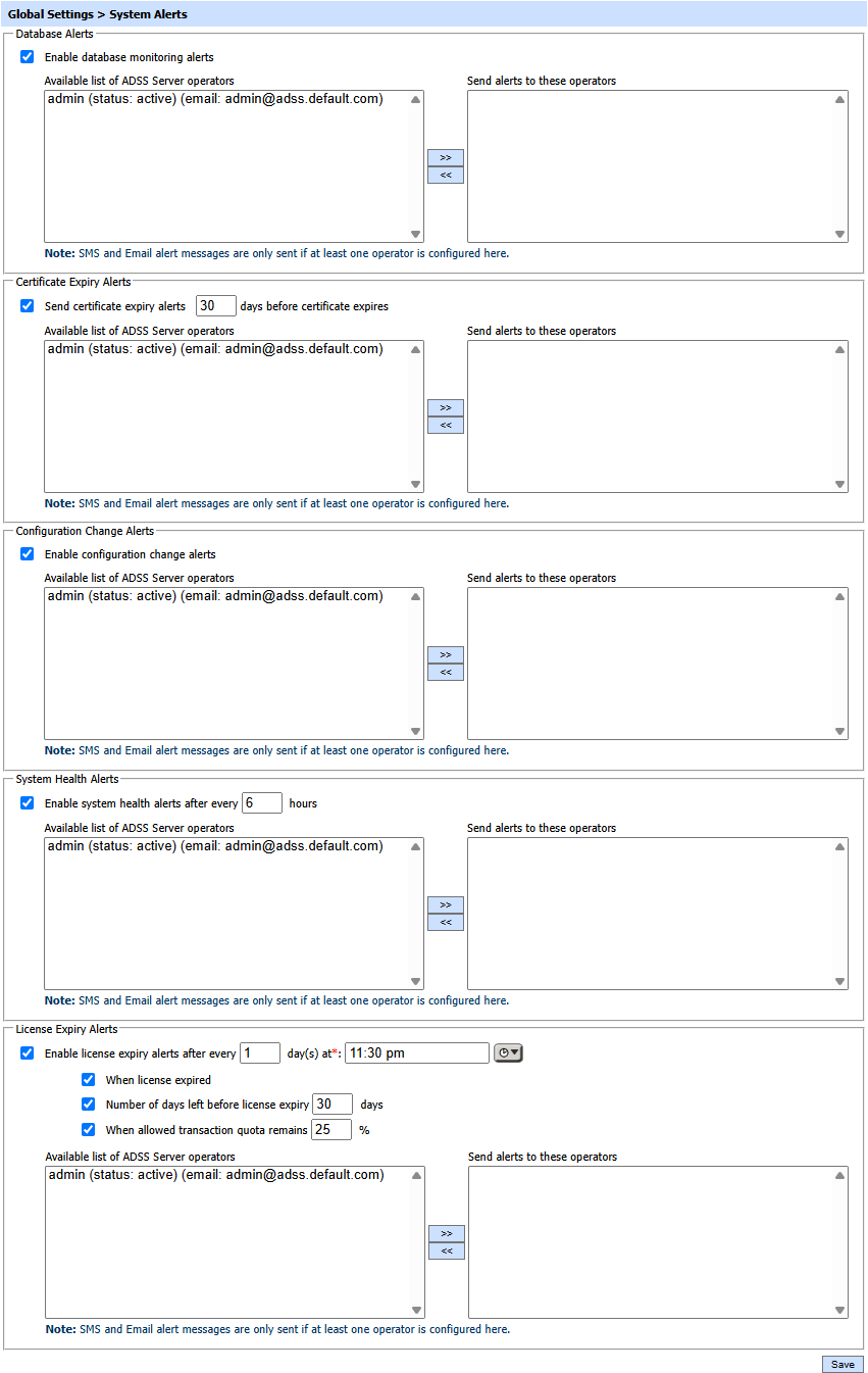 To enable automated global alerts i.e. "Database Alert", "Certificate Expiry Alert", "Configuration change Alert" and "System Health Alerts", use these configurations: