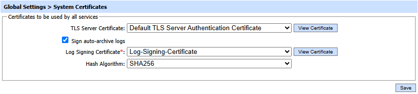 This page is used to configure the TLS Server Authentication Certificate and Logs Archive signing certificate as shown below: