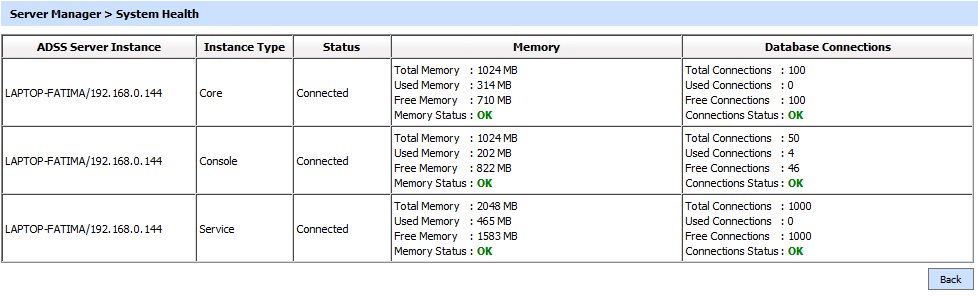 Click on the System Health button from the Server Manager page and it will redirect you for ADSS Server overall system status. From this page you can check the status of all the instances, memory usage and database connections usage.