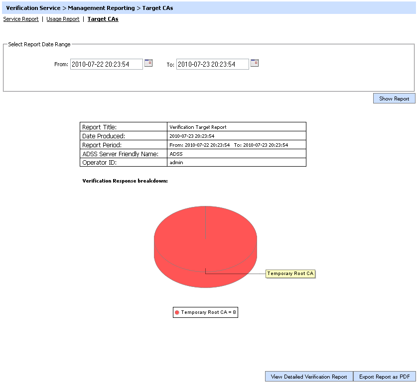Use the Export Report as PDF button to save the report as a PDF file. The View Detailed Verification Report button shows the actual figures on a per target CA basis for the given date range as shown in the following screen: