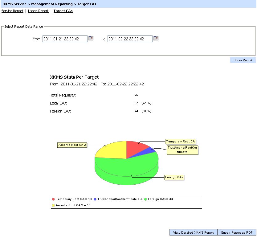 Use the Export Report as PDF button to save the report as a PDF file. The View Detailed XKMS Report button shows the actual figures on a per target CA basis for the given date range as shown in the following screen:
