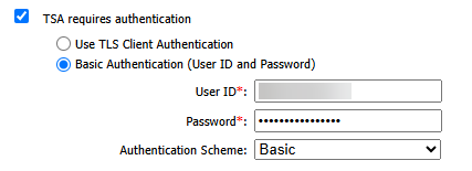 If this option is enabled then ADSS Server will communicate with Timestamping authority using user ID and Password based authentication. It defines the following: |
