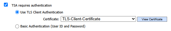 If this option is enabled then ADSS Server will communicate with Timestamping authority using TLS Client Authentication. Select the TLS Client Certificate which pre-exists in the Key Manager. Note: It is required to register the Issuer CA of the TLS Client certificate in Trust Manager with the purpose CA for verifying TLS client certificates purpose. |