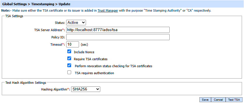 When this checkbox is enabled, the TSA will include its certificate in Timestamp response. Note: This checkbox should be selected to generate and enhance a digital signature to a timestamped level. |
