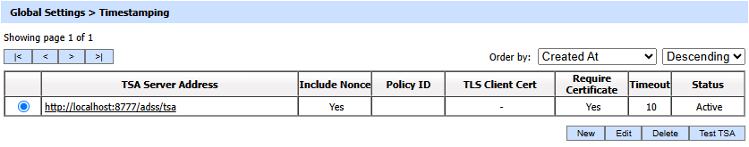 The table of Timestamping authorities can be sorted in either Ascending or Descending order by selecting a table column from the drop down list. The list can be sorted by "Server Address", "Policy ID", "Include Nonce", "Timeout", "Require Certificate", "Created At" or "Status".