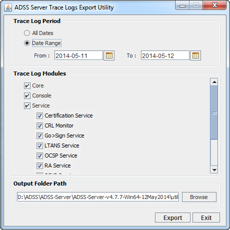[root@localhost bin]# export_logs.sh -fromDate 2014-03-13 -toDate 2014-03-13 -logType core,console,service -serviceNames signing,verification,certification,crlmonitor,gosign,ocsp,tsa,ra,ltans,scvp,xkms,csp,sam,ras -out /home/admin