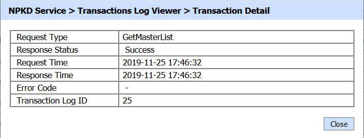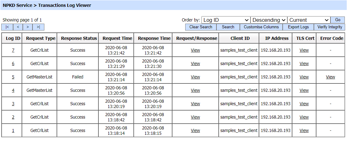 Clicking on View link under this column displays the TLS client authentication certificate. The View link is only present when TLS client authentication was used to send requests to the NPKD service.